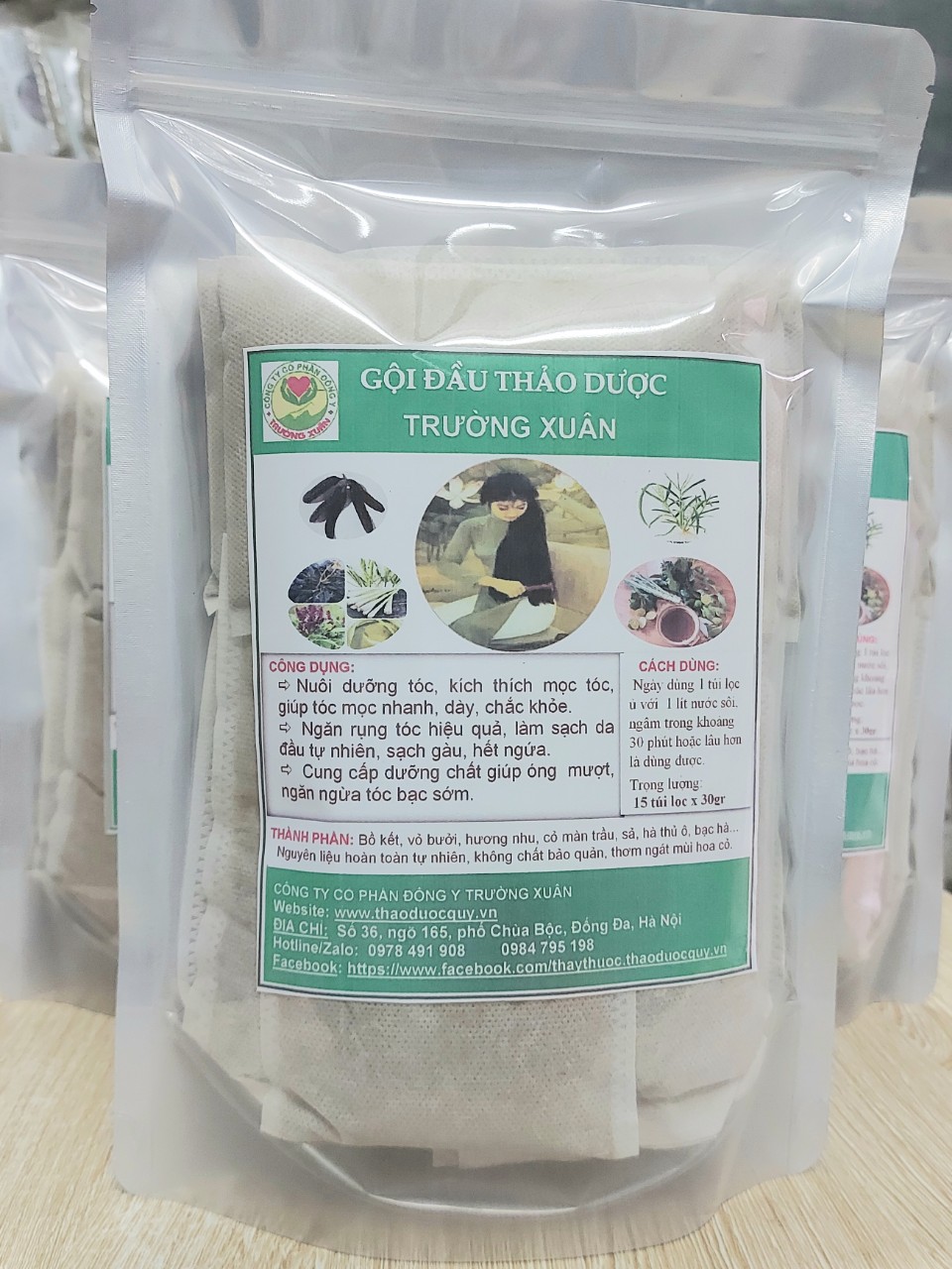 Thảo dược gội đầu Trường Xuân là một bài thuốc 12 vị, giúp nuôi dưỡng tóc chắc khỏe tử bên trong, tăng cường cung cấp dưỡng chất, ngăn ngừa gãy rụng và chống bạc sớm rất hiệu quả.
